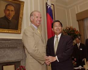 拜登(民主黨,德拉瓦州)偕聯邦參議員薩辨思(Paul Sarbanes,民主黨,馬里蘭州)、史派克特(Arlen Specter,共和黨,賓州)、湯普森(Fred Thompson,共和黨,田納西州)等人,由我國外交部次長吳子丹及美國在台協會台北辦事處處薄瑞光陪同,前來總統府拜會總統,總統府副秘書長簡又新、國家安全會議諮詢委員高英茂也在座。